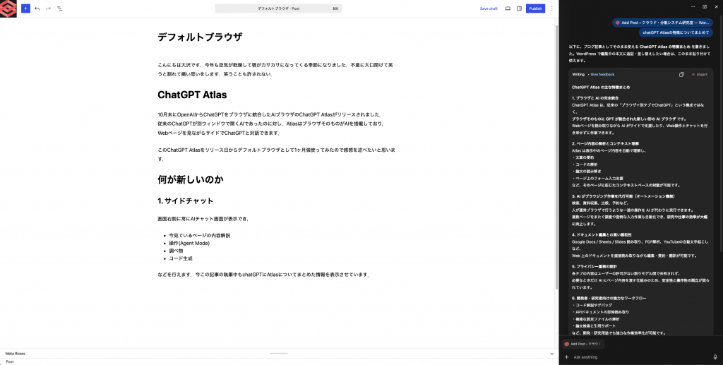 などを行えます.今この記事の執筆中もchatGPTにAtlasについてまとめた情報を表示させています.