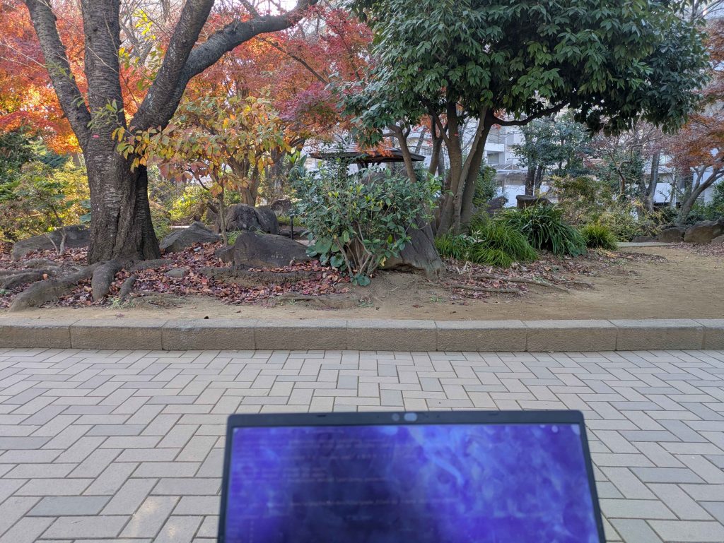 最近は土日もテクニカルレポートや卒業論文を書いたりプログラムを書いたりすることが多くなっています.そんなときは,家にいると誘惑が多いため,外で作業をすることも多くなってきました.最近のお気に入りは,川口駅前にある川口西公園(リリアパーク)です.外で作業と聞くと,カフェとかを想像されると思いますが,私は本当に外でベンチに座って作業しています.