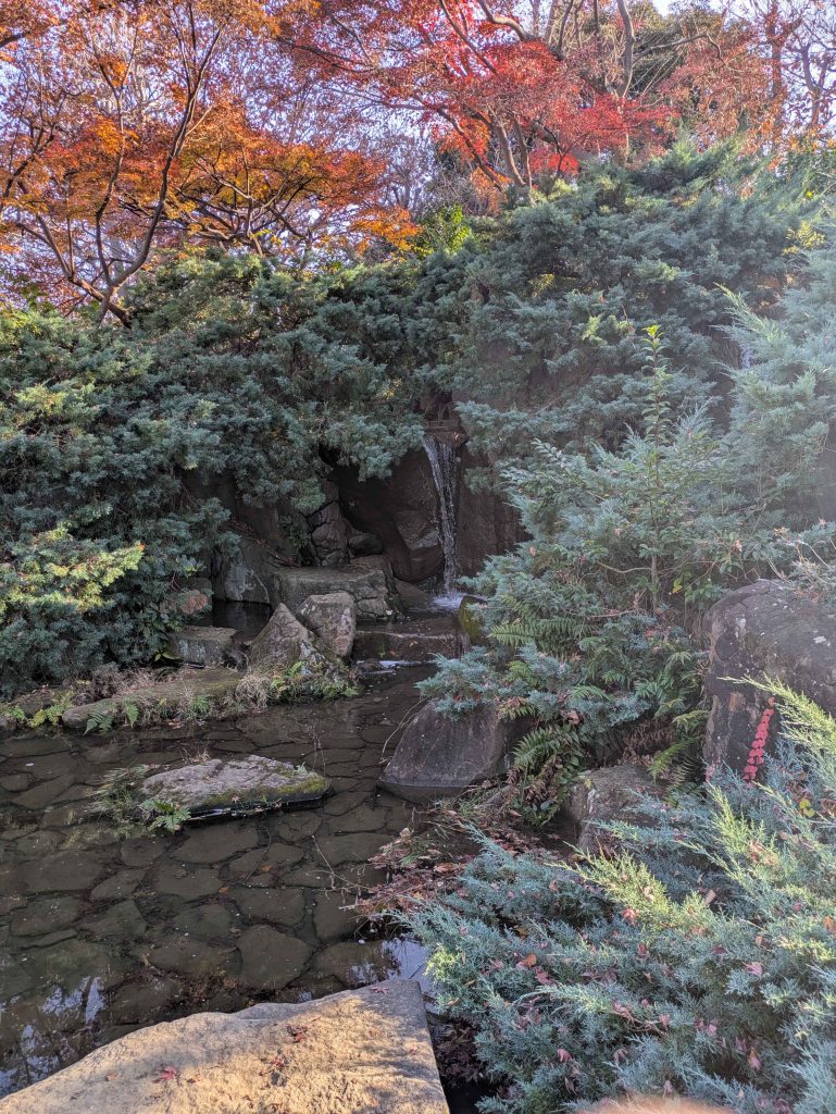 意外にも,滝の流れる音や小鳥の鳴き声が天然のBGMになりますし,開放感があってリラックスしながらほどよく集中できます.近くにトイレや水飲み場も完備してあって快適ですね.難点としては,最近は少し寒いことと,机がないので首が下向くので長時間いると疲れること,zoomも流石にここではできないので気になりますね.簡易机っぽいものはそのうち用意したい.