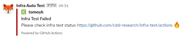 テストが失敗するとSlackに次の通知が流れます.これでいつ何が起きたのかを検出できるようになりますね.