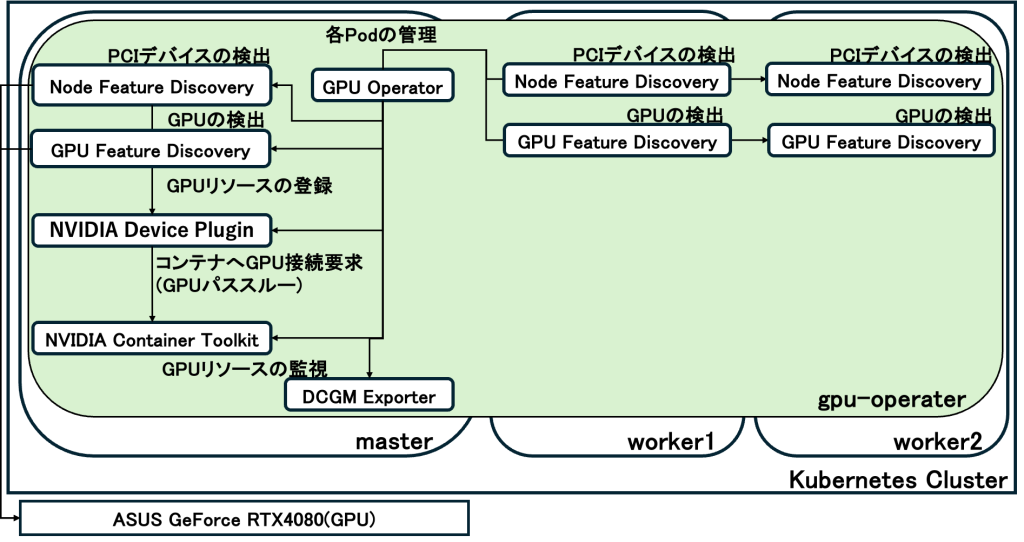- クラスター全体の管理を行います.各ノードの状態を監視し,必要に応じてドライバーや各種Pod(Device Plugin)を自動でデプロイする役割