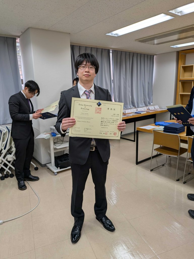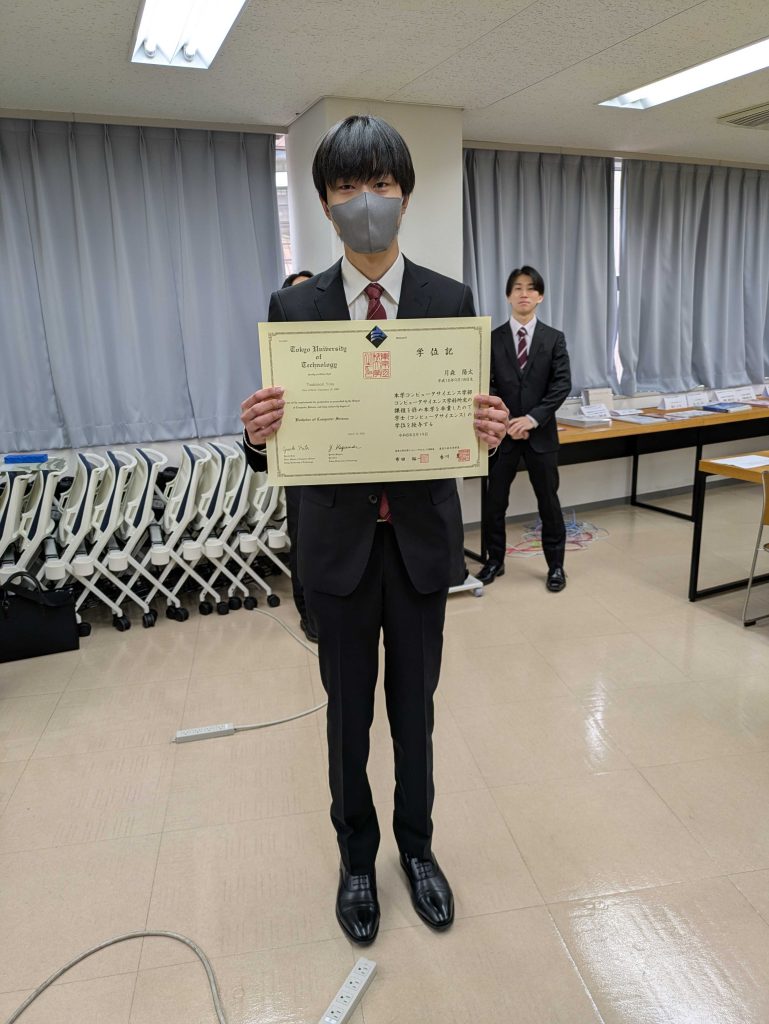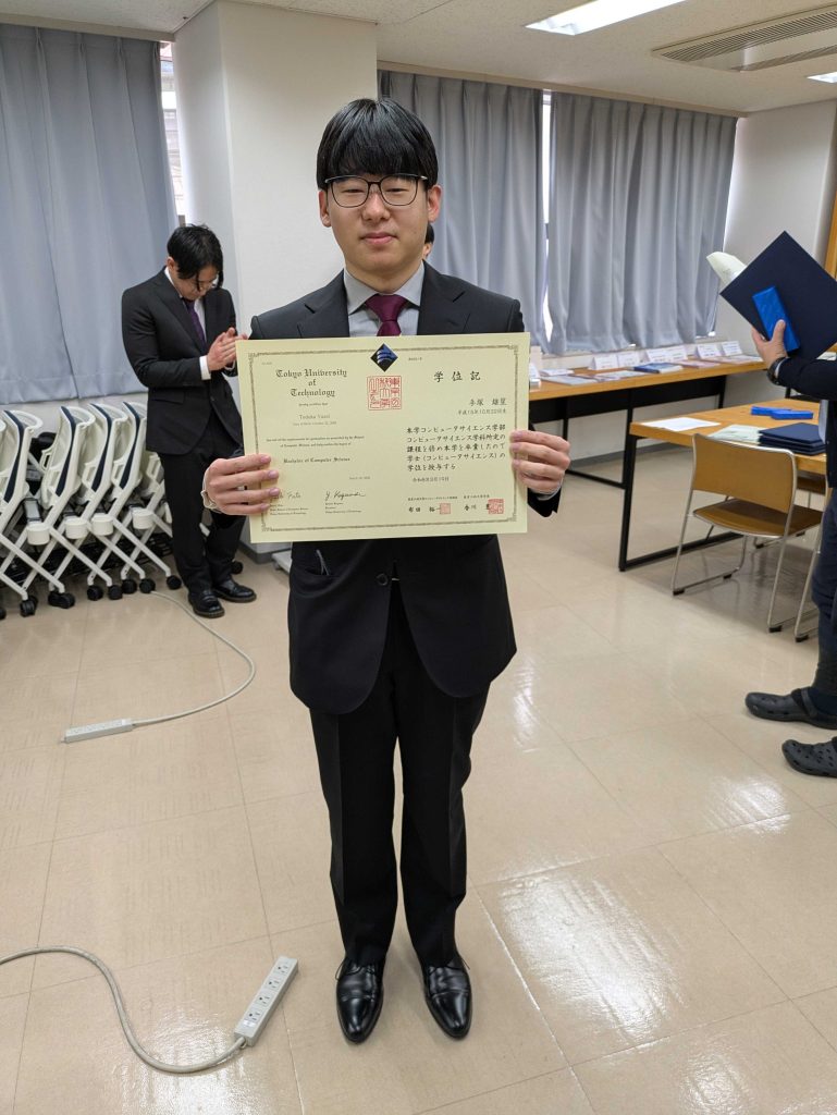 CDSLの26卒の学生が卒業しました(3) 投稿日: 2026年3月21日 投稿者: Kaito Arita 2026年3月19日にCDSLの26卒の学生が卒業しました. 山﨑拓海さん 月森陽太さん 手塚雄星さん